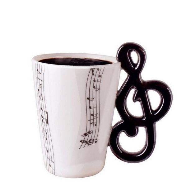 Porcelánový originální hrnek s potiskem not, víčkem a uchem netradičního tvaru. Výška hrníčku je cca. 10 cm.