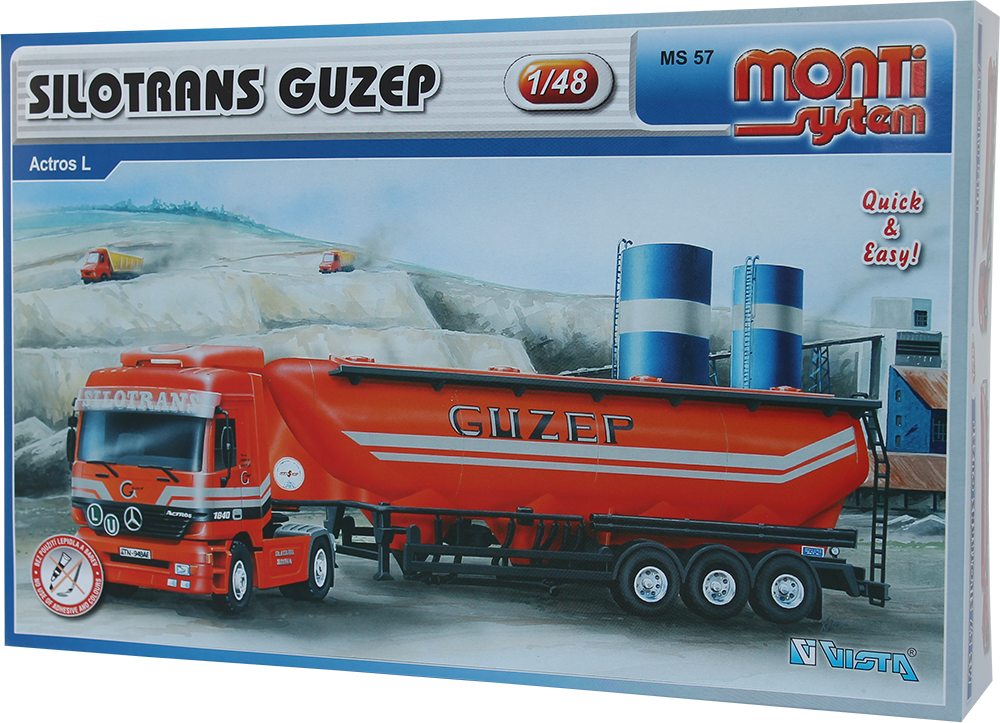 Mercedes Actros Silotrans Guzep MS 57 je plastový zacvakávací model auta z Monti Systemu. Sestavení modelu z této zacvakávací stavebnice je docela rychlé, jelikož k montáži nepotřebujete lepidlo a barvy.