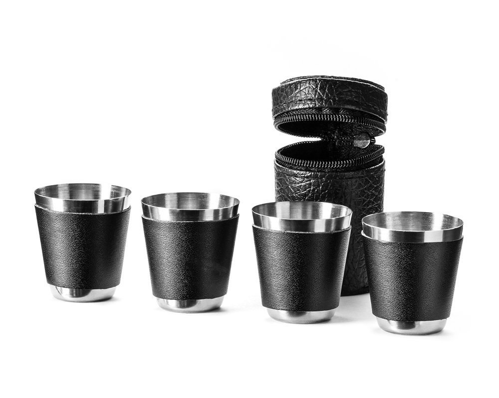 Výborná sada cestovních nerezvých panáků v praktickém balení do koženého pouzdra. Moderní cestovní panáky mají objem cca 25 ml (rozměr: 4,5 cm výška x 3,5 cm průměr). Sada obsahuje čtyři kusy.