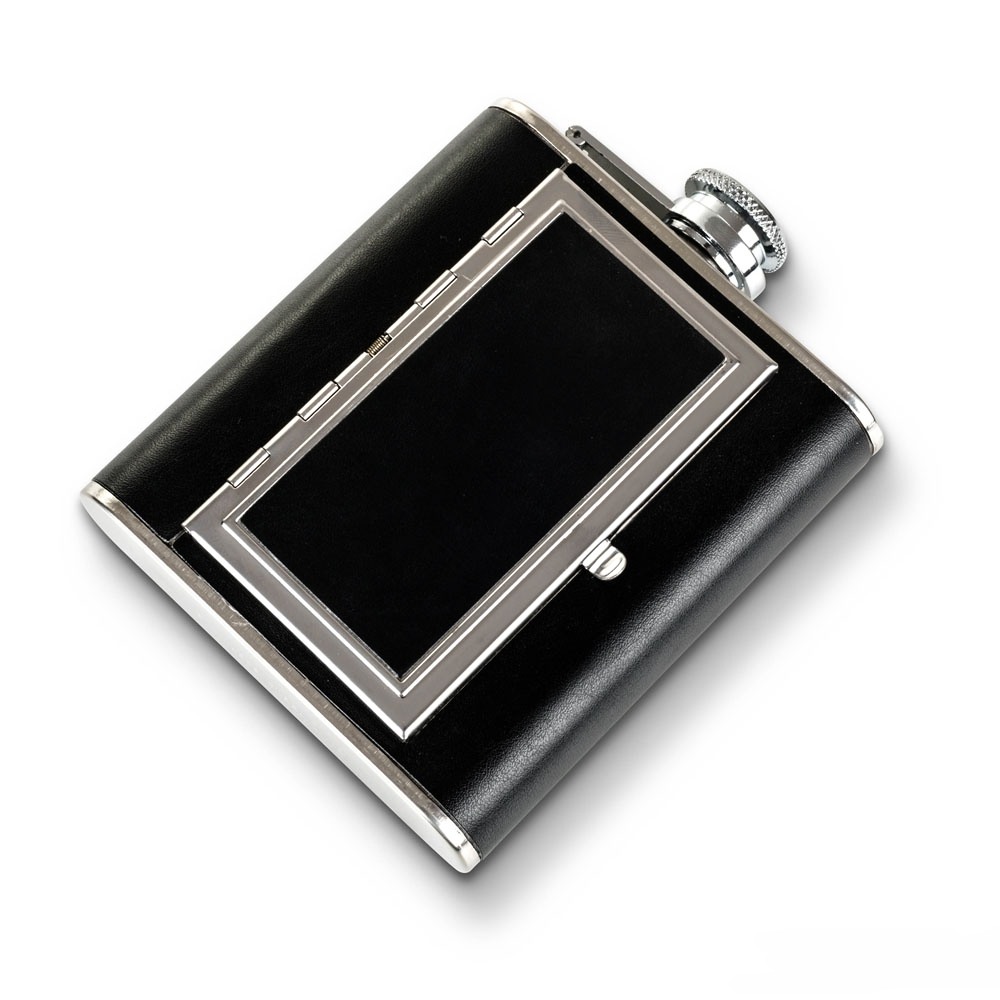 Originální velká nerezová placatice s pouzdrem na cigarety o objemu 160 ml. Velikost placatice: 10 x 12,5 x 3 cm.