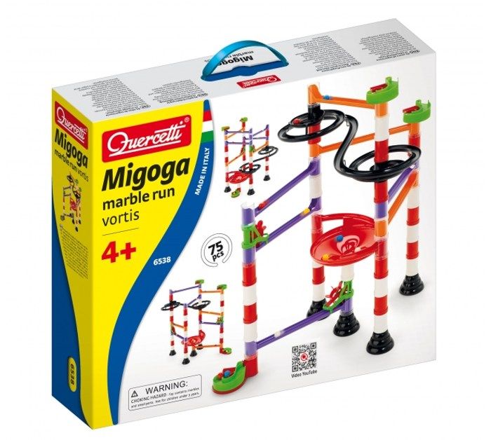 Quercetti kuličková dráha Migoga Marble Run Vortis je moderní a velmi zábavná kuličková dráha, která umožní sestavit mnohotvárné dráhy obohacené sběrnými koši, spirálami, můstky, mlýnky a zásobníky s pružinou, jež jsou umístěny vždy na začátku a konci dráhy a zajištují plynulé spouštění kuliček.