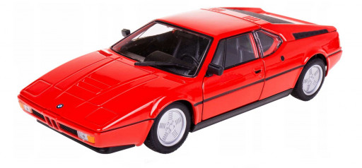 Kovový model auta BMW M1 v červené barvě a měřítku 1:24 značky Welly. Model má detailní zpracování karoserie včetně interiéru automobilu. Na modelu se otvírají přední dveře a kapota motoru.