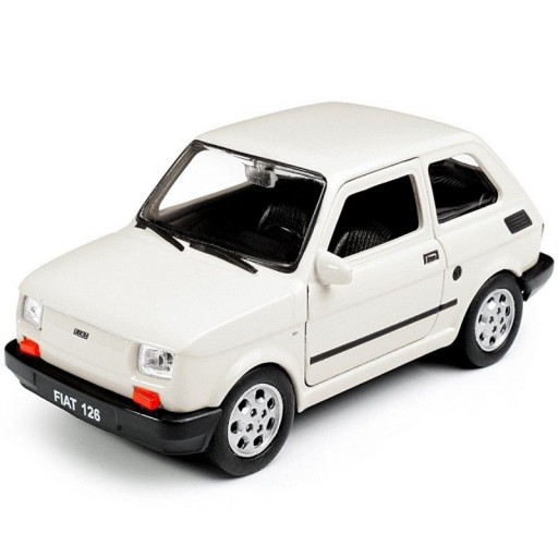 Kovový model auta Fiat 126 bílé barvy v měřítku 1:34/39 značky Welly. Model autíčka má kovové osy kol a detailní zpracování karoserie včetně interiéru automobilu. Na modelu se otvírají dveře.