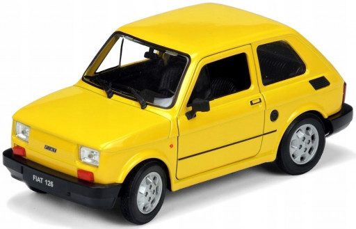 Kovový model legendárního autaFiat 126 (Maluch) v měřítku 1:21 značky Welly. Model auta má otevírací dveře, otevírací kapota motoru, natáčecí přední kolečka a detailní zpracování karoserie včetně interiéru automobilu.
