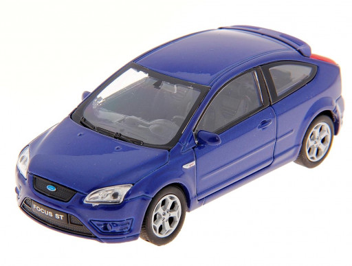 Kovový model auta Ford Focus ST v modré barvě a měřítku 1:34/39 značky Welly. Model autíčka má kovové osy kol a detailní zpracování karoserie včetně interiéru automobilu. Na modelu se otvírají přední dveře.