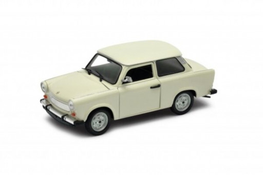 Kovový model auta Trabant 601 v krémové barvě a měřítku 1:34/39 značky Welly. Model autíčka má kovové osy kol a detailní zpracování karoserie včetně interiéru automobilu. Na modelu se otvírají dveře.