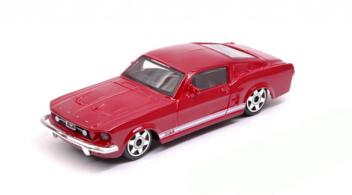 Kovový model aut Bburago Ford Mustang GT (1967) v červené barvě a měřítku 1 : 43. Autíčko má vyrobnou karoserii z kovu a plastový podvozek.