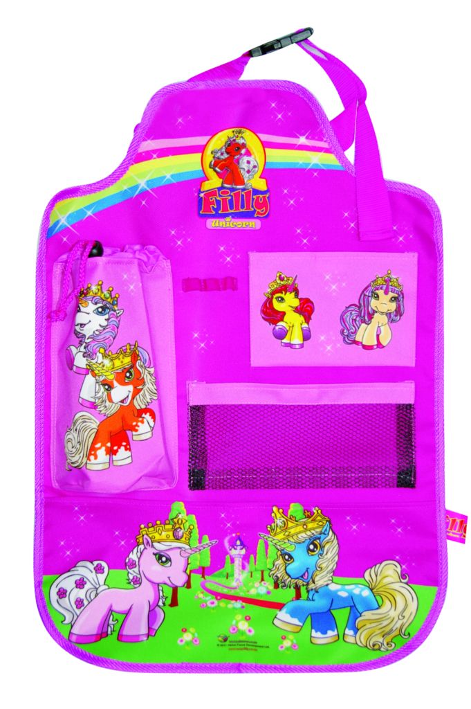 Dětský doplněk do auta- chránič sedadla a organizér s oblíbeným designem Filly koníčci , zabaví Vaše děti a zároveň ochrání sedadlo před dětskou kreativitou. Kapsář má zapínací i nezapínací dokonce i stahovací úschovné prostory. Spodní část s obrázkemkoníka FIlly je z lesklého materiálu. Kapsář se jednoduše upevňuje pomocí umělohmotného zapínání na zadní část přední sedačky. Rozměr: 40 x 60 cm