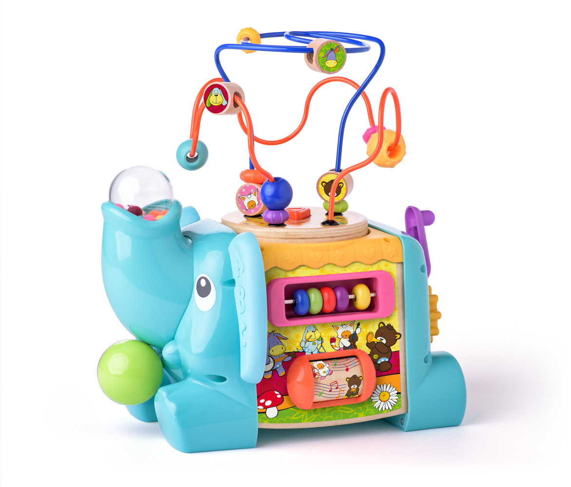 Didaktický slon nabízí dětem nespočet herních variant. Barevné provedení zaujme každého malého objevitele. Zatáhněte za míč v pusince slona, pusťte a sledujte korálky v chobotu. Kličkou na zadečku rozpohybujete ozubená barevná kolečka. Na boku slona naleznete malé bludiště se sovičkou a ptáčkem. Na druhém boku je umístěno počítadlo s barevnými korálky a váleček s notami. Na zádech nosí slon nádherný labyrint, který lze odejmout a děti si s ním mohou hrát samostatně. S touto hračkou děti procvičují nejen jemnou motoriku, trpělivost, přesnost, barvy, ale i soutěživost. Rozměr: 27 x 18,5 x 29 cm. Věk: 6m+.