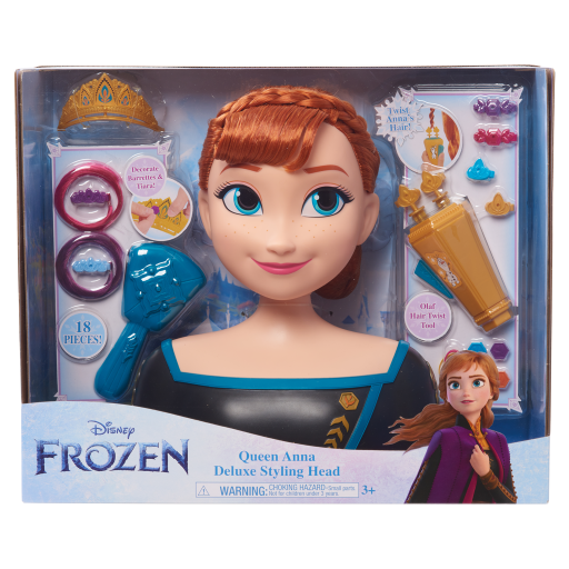 Stylingová hlava Deluxe Anna je dodávána s 18 doplňky do vlasů, včetně kartáče, nástroje Olaf na natáčení vlasů, diadém, čtyř vlasových drahokamů, čtyř vlasových sponek, čtyř gumiček do vlasů a dvou prodloužení vlasů