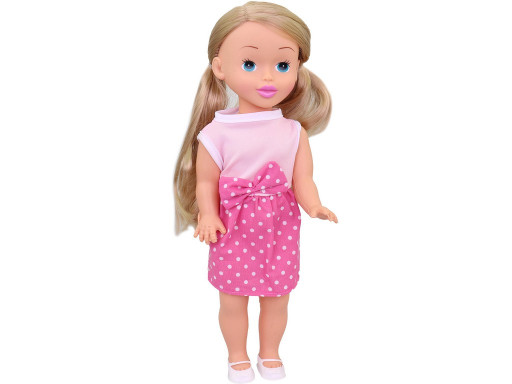 Klasická plastová panenka v šatech. Panenka má světlé dlouhé vlasy učesané do dvou copů, velké modré oči s řasami a krásné bílé botičky, které se dají zout. Pohyblivá hlava, ruce a nohy.