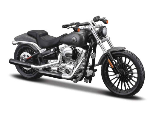 Kovový model motorky Harley Davidson Breakout (2016) značky Maisto v měřítku 1 : 18. Motorka má délku cca. 13 cm, šířku (včetně řídítek) cca. 5 cm.