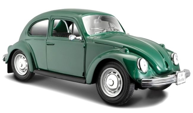 Kovový model auta Volkswagen Beetle ( 1973 ) zelený v měřítku 1:24 značky Maisto. Model má detailní zpracování karoserie včetně interiéru automobilu.