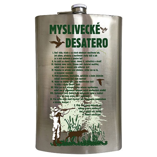 Nerezová placatka na alkohol se šroubovacím uzávěrem vám pomůže vyléčit neduhy nebo zahnat zimu. Placatice má potisk s motivem pro myslivce a milovníky přírody - Myslivecké desatero.