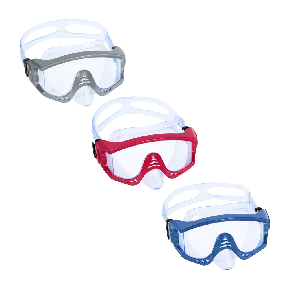 Potápěčské brýle TIGER ve třech barevných variantách - červené, modré a šedé. Širokoúhlá skla, polykarbonátové čočky s ochranným povrchem chránícím proti UV záření. Dvojitý lem pro přesné přilnutí a zabránění průsaku. Plně nastavitelný dělený silikonový pásek. Použité materiály nejsou na bázi latexu. Věk: 14+
