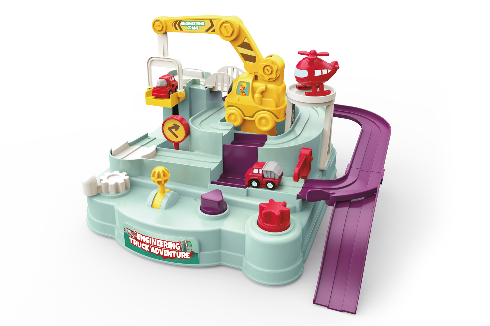 Překážková dráha. Rozměry 24x24x17 cm. Rozměry auta 3,5x2,5x3,5 cm. 4 ovládací prvky (kolečka, páčky). Součástí 2 auta. Věk: 3+