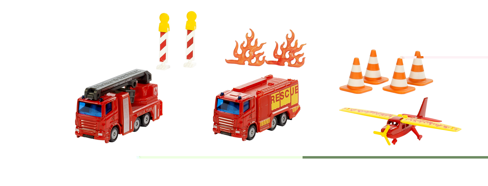 Do řídícího střediska přichází tísňové volání. V nemocnici hoří! Hasiči se připravují na svou misi. Tato nová hasičská jednotka ze Siku spojuje tři unikátní záchranná vozidla. Třínápravové těžké nákladní vozidlo s kovovou kabinou řidiče je vybaveno záchrannou plošinou, která se otáčí o 360 stupňů a má tři kloubové spoje. To znamená, že žebřík s připojeným košem může být vytažen do impozantní výšky a koš může být podle potřeby narovnán. To výrazně zjednodušuje záchranu i z velkých výšek. Obě vozidla mají vysokorychlostní kola, takže mohou jet rychlostí blesku. Pro přepravu a monitorování ze vzduchu je součástí setu letadlo v barvách hasičského sboru. Se sklopným křídlem a rotující vrtulí je toto záchranné letadlo nezbytným partnerem pro obtížná nasazení. Sada obsahuje také sloupky a kužely, aby se uzavřelo místo nehody. Součástí sady jsou i malé plameny. Rozměr balení: 29,6 x 11 x 4,8 cm. Věk: 3+