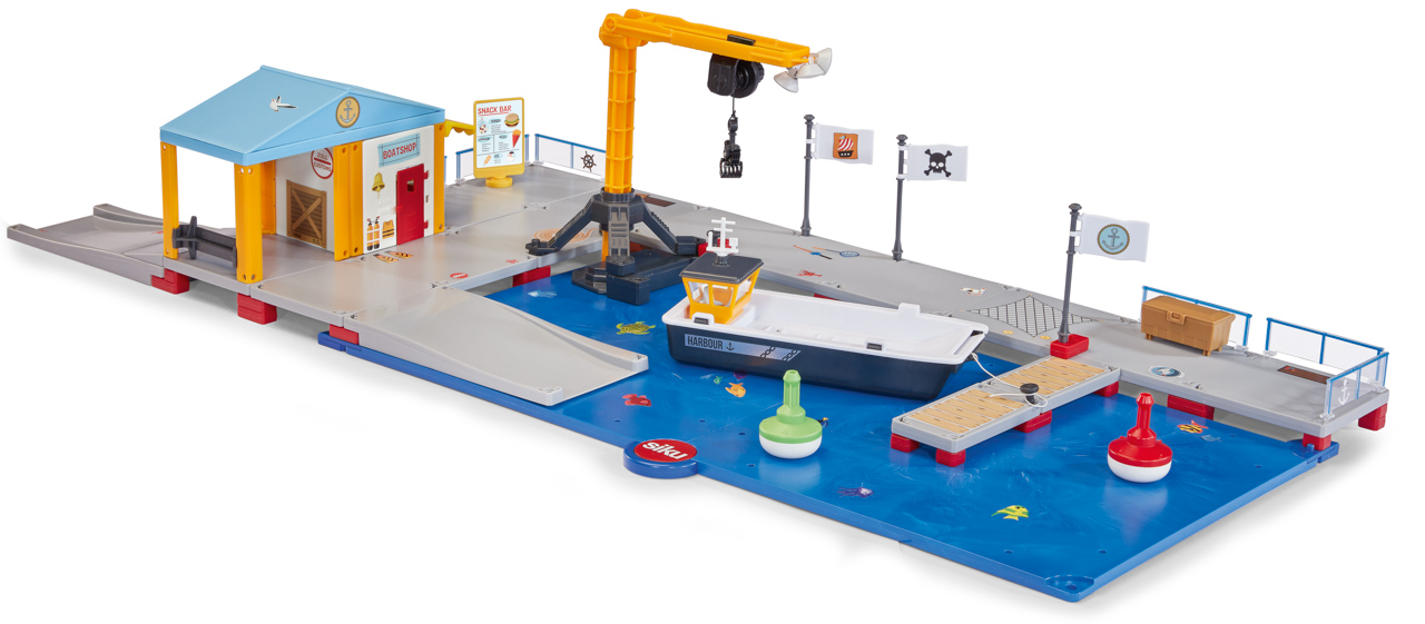 SIKU World – nakládací přístav, molo. Z jednotlivých dílů lze plochu přístavu sestavit několika různými způsoby. Jakmile máte hotovo, ozdobte si přístav pomocí přiložených samolepek (65ks) dle své fantazie. Loď lze spustit do vody nebo vytáhnout ven pomocí nájezdové rampy. Ve stánku s rychlým občerstvením si pracovníci přístavu dávají k obědu ryby a hranolky. Po skončení polední přestávky pomáhají pracovníci přístavu ukotvit loď k molu. K bezpečnému ukotvení lodi k vazáku na molu je potřeba několika zručných akcí. Pohyblivé rameno jeřábu s pojezdovým vozíkem a speciálním chapadlem pomáhá vyložit náklad z lodi. Náklad musí být vyložen rychle, protože kapitán chce brzy vyplout. Nakládací přístav SIKUWORLD se skládá z nákladní lodi, bójí, dvou vlajek, stánku s občerstvením, mola, rampy, dvou základních plastových desek v modrém provedení, jeřábu a přepravního boxu. Přepravní box lze otevřít, plnit a vyprazdňovat. Nakládací přístav SIKUWORLD je dokonalým doplňkem vodního světa SIKUWORLD a kontejnerové lodi SIKUWORLD. Rozměr hrací plochy cca: 90 x 36 cm. Sada obsahuje více než 100 dílků. Rozměr balení: 41 x 27,6 x 7,3 cm. Věk: 3+. Video: https://www.youtube.com/watch?v=jgcFl_Hm36U