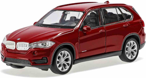 Kovový model auta BMW X5 v červené barvě a měřítku 1:34/39 značky Welly. Model autíčka má kovové osy kol a detailní zpracování karoserie včetně interiéru automobilu. Na modelu se otvírají přední dveře.