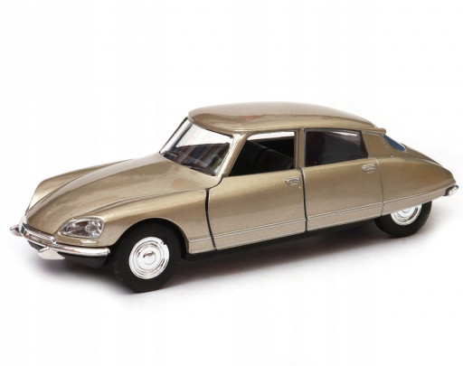 Kovový model auta Citroen 1973 DS 23 zlaté barvy v měřítku 1:36 značky Welly. Model autíčka má kovové osy kol a detailní zpracování karoserie včetně interiéru automobilu. Na modelu se otvírají přední dveře.