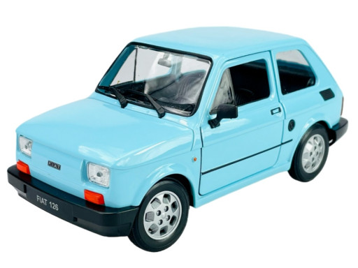 Kovový model legendárního autaFiat 126 (Maluch) v měřítku 1:21 značky Welly. Model auta má otevírací dveře, otevírací kapota motoru, natáčecí přední kolečka a detailní zpracování karoserie včetně interiéru automobilu.