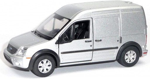 Kovový model auta Ford Transit Connect v stříbrné barvě a měřítku 1:34/39 značky Welly. Model autíčka má kovové osy kol a detailní zpracování karoserie včetně interiéru automobilu. Na modelu se otvírají přední dveře.