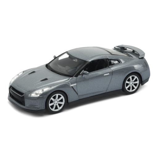 Kovový model auta Nissan GT-R v šedé barvě a měřítku 1:34/39 značky Welly. Model autíčka má kovové osy kol a detailní zpracování karoserie včetně interiéru automobilu. Na modelu se otvírají přední dveře.